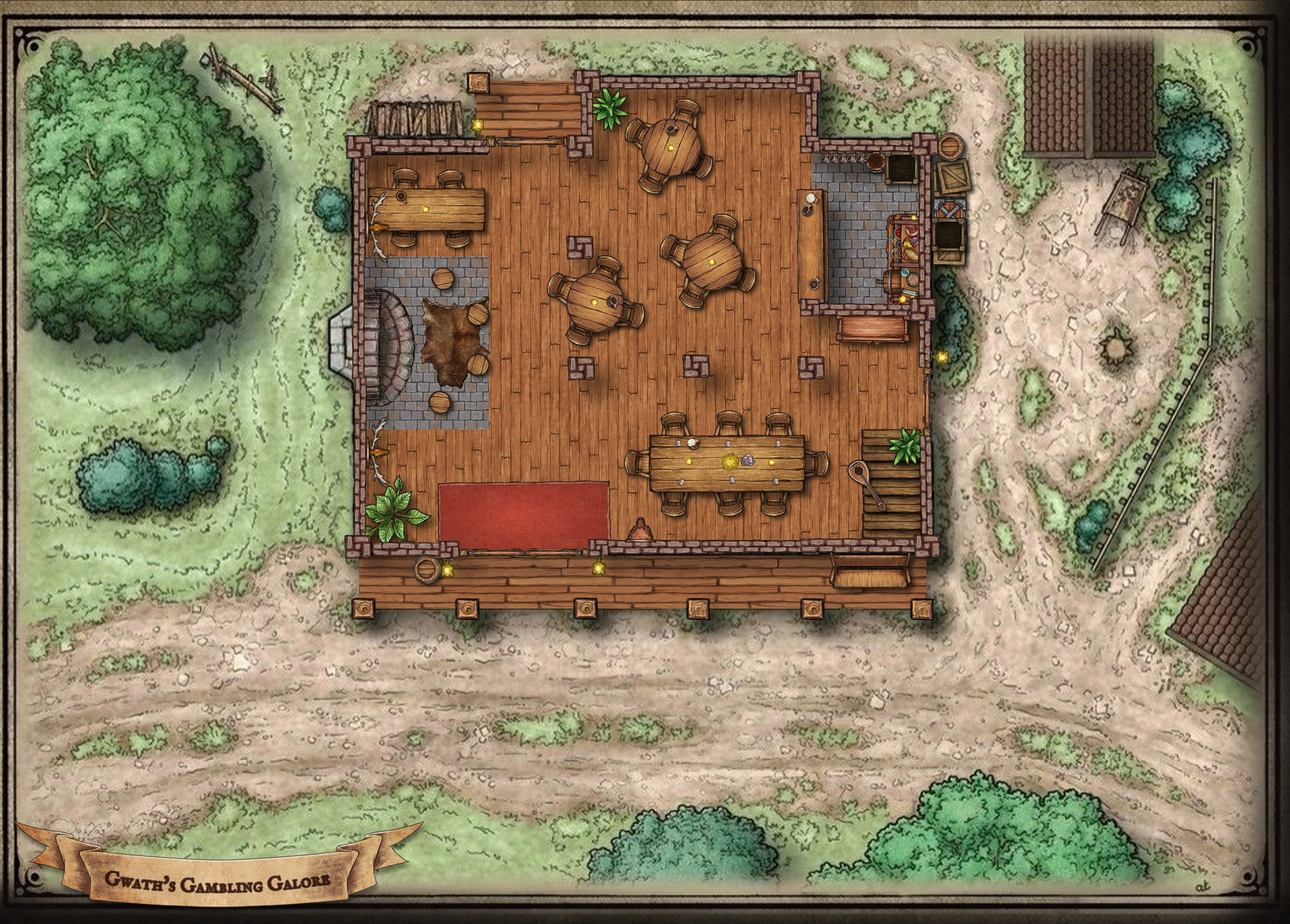 Information Azareah, Cepheon, Deimus and Draco are able to buy "The Sleeping Giant" Inn from Halia Thornton for a symbolic 1 Gold. This as a thanks for all their efforts in keeping Phandalin safe. But the Inn is in a horrible state and therefor they hire non other then the famous Neverwinter Carpenter: Mabraeck Oakbelt to completely renovate it into their own gambling hut: "Gwath's Gambling Galore". Mabraeck didn't even have to draw anything, because the whole project was drawn by Deimus the Trickster. There is place for a musician, multiple gambling tables, a nice fireplace and ofcourse a fancy bar. Featured in: Chapter 34: Sildar Hallwinter Returns Chapter 40: Dragon of Icespire Peak (Click on the chapter for more information or to listen to the chapter) |