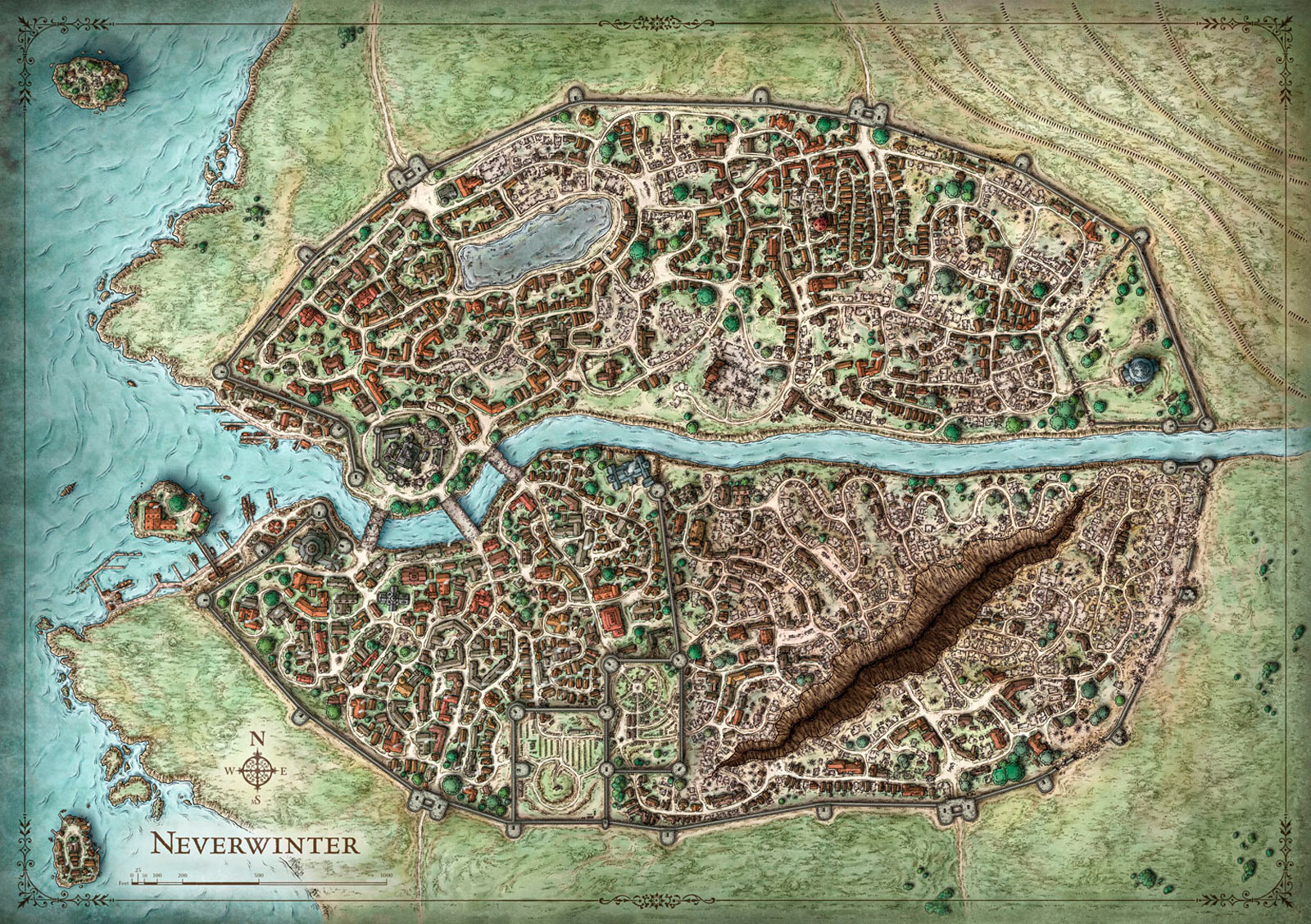 History A long time ago an eruption of the closeby "Mount Hotenow" resulted in an earthquake and combination of pyroclastic flow and lava that destroyed much of Neverwinter. A great rift known as the Chasm ripped apart the southeastern quarter of the city, and strange ash zombies and plaguechanged horrors haunted the ruins, released from the plagueland below Neverwinter. Thousands of citizens died during the cataclysm, including the Alagondar royal family, while many others fled to other cities, leaving only a desperate few to carve out an ill existence among the ruins. The remaining Neverwintians were determined to survive in spite of the tragedy, however, and put a brave resistance against the plaguechanged horrors. They eventually built the Wall, using debris and other materials, sacrificing the southeastern quadrant but securing the rest of the city. The Blacklake District endured the cataclysm almost unscathed, and for a time it became the center of the city. Lord Dagult Neverember, seeing an opportunity to add to his financial empire, hired workers to help rebuild the city and guards to protect it from monsters and bandits. Claiming to be a descendant of Neverwinter's former rulers and thus the rightful "Lord Protector" of the city, Dagult started the New Neverwinter movement. Lord Neverember invested a great deal of his own fortune to rebuild the city's infrastructure, buy the interest of merchants to send their caravans again to Neverwinter, and even ensure Neverwintan refugees had enough food and gold in hand. Neverember's efforts to rebuild the city proved successful, and Neverwinter had slowly been restored as a center of civilization in the Sword Coast North. Geography Neverwinter stands on the northern Sword Coast, on the High Road between Waterdeep and Luskan, specifically between Leilon and Port Llast. To the east lies the Neverwinter Wood and, at its heart, the volcanic Mount Hotenow. The Neverwinter River is heated by fire elementals living under the volcano before flowing through the forest and the city. It carries its supernatural warmth with it, keeping the river and harbor from freezing up in winter and the gardens green year-round. The heat given off by the river creates a permanent warm climate in the immediate area. Therefore the name: Neverwinter. Blacklake District: This district lies in the northwest of Neverwinter and the most common folk lives in this district. It holds all kind of workshops like carpenters, smiths, provisions etc. The main Inn in this district is the Beached Leviathan; a more affordable Inn which is a ship that is rebuild like an Inn and tavern that lies in the harbour. Also in this district you will find Neverwinter Castle, where the Lord Protector has its residence. Tower District: This district in the northeast is a very dangerous district and has been taken over by orcs and goblins after the eruption and they are also in charge here. You don't want to come here, they are very hostile and territorial. But also tolerated to keep them happy. The Chasm: This district is still completely destroyed and a large crater splits from north to south through this district. It has been destroyed and looks like a war zone. Only beggars, vagrants and homeless people "live" here. Protectors Enclave: The last but not the least district of Neverwinter lies in the southwest. The rich part of Neverwinter with for example the Palace of Justice where court cases are held. Beautiful homes and large homes like Cepheons you will find in this district. The main inn and tavern in this district is the "Moonstone Mask", a luxurious Inn and therefor expensive. The "Moonstone Mask" is also the place where Deimus lives and spends most of his time in Neverwinter. |